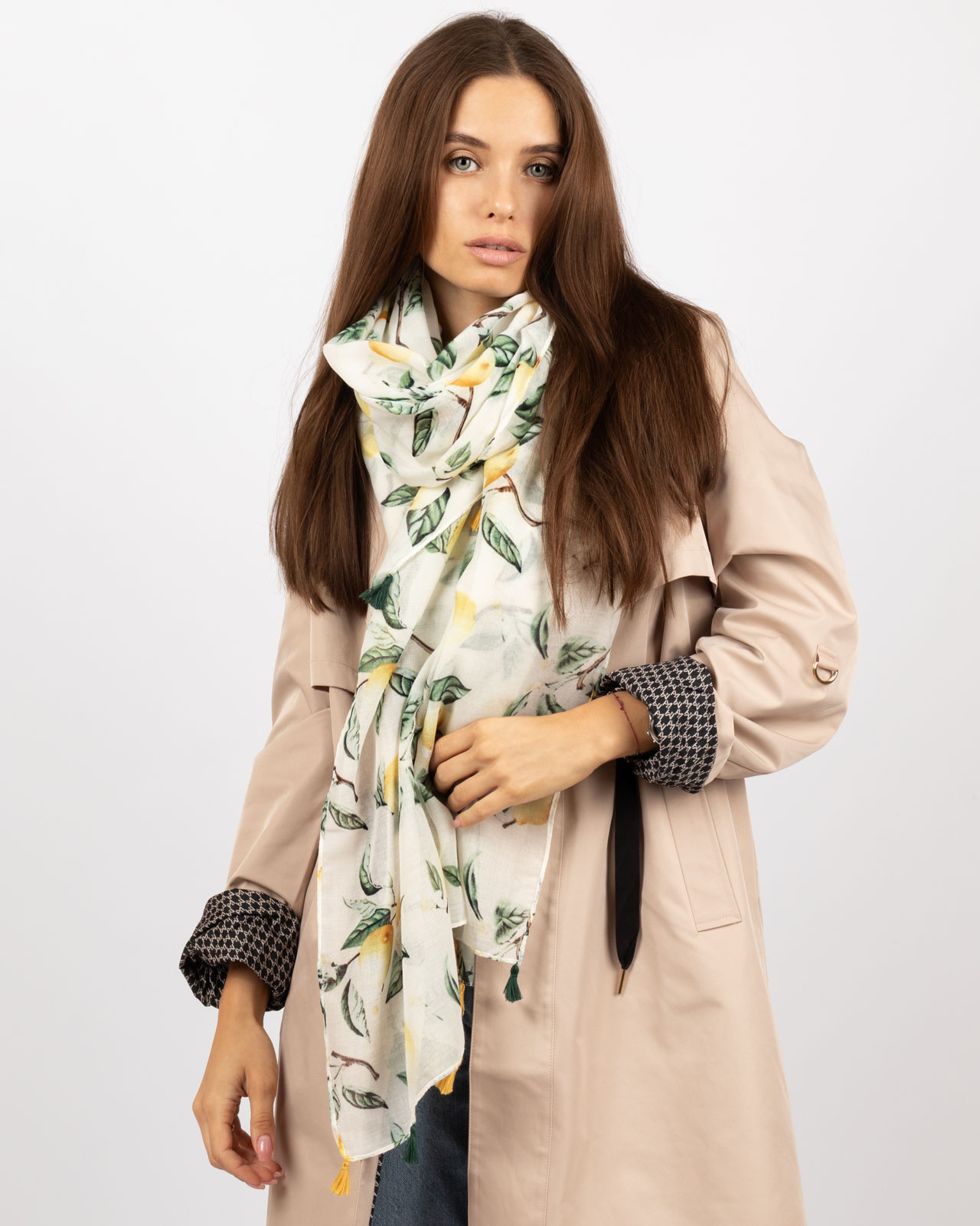 Cienka, prześwitująca chusta z frędzlami na końcu