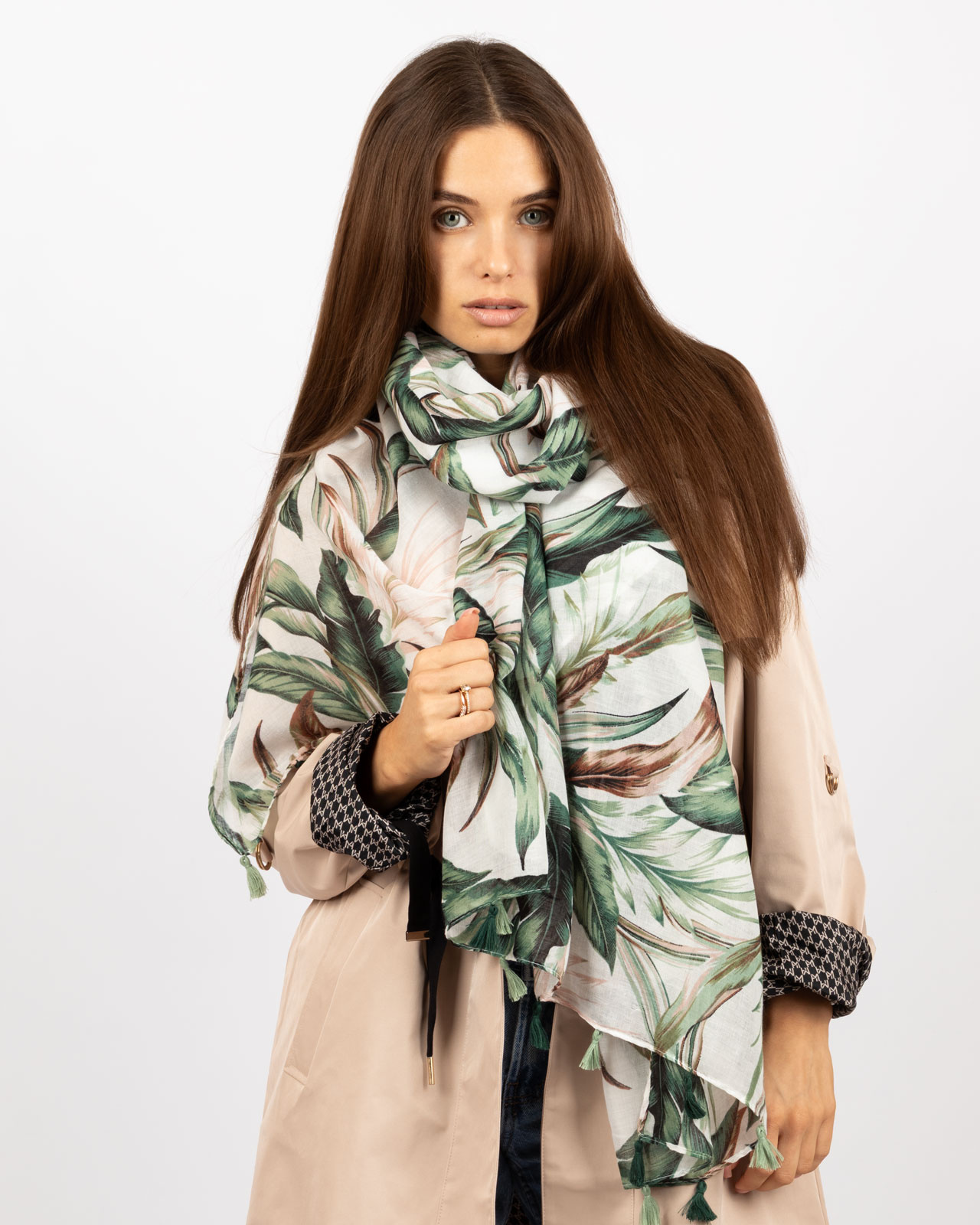 Cienka, prześwitująca chusta z frędzlami na końcu